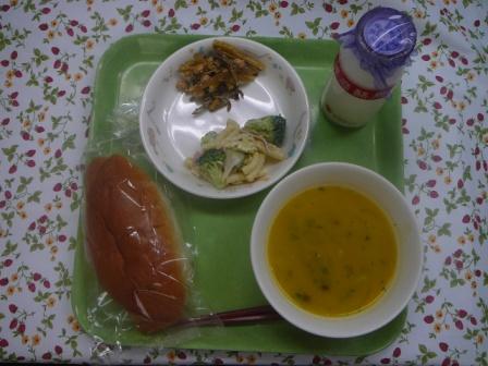 ミルクパン かぼちゃのポタージュ マカロニサラダ ミックスかりんとう 牛乳