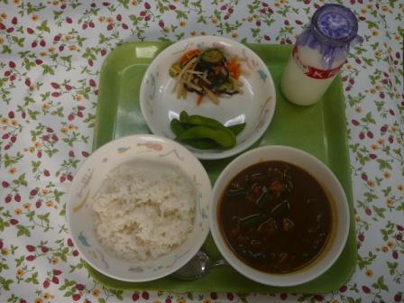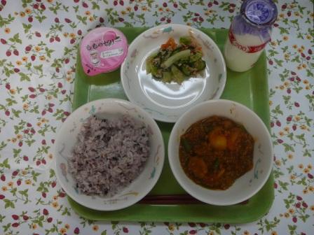 麦ごはん 夏野菜のカレー カミカミサラダ 枝豆 牛乳
