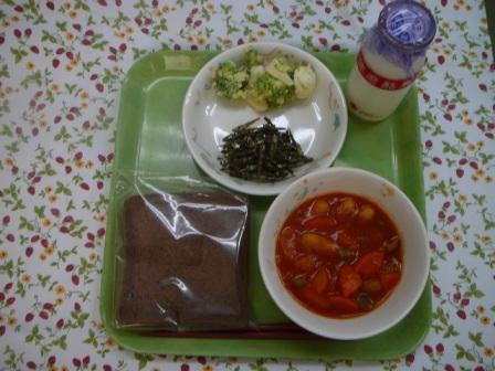 ココアパン ウィンナーのチリソース煮 ミモザサラダ いりこの青のりあえ 牛乳