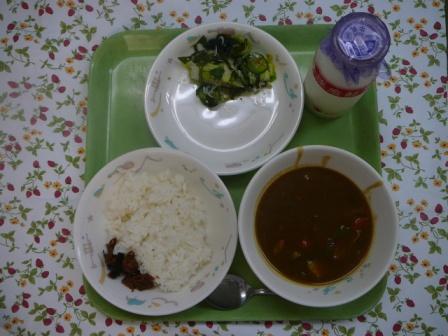 ごはん チキンカレー 海藻サラダ べっこうづけ 牛乳