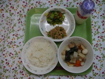 ごはん おでん風煮 すき昆布サラダ 鶏そぼろ 牛乳
