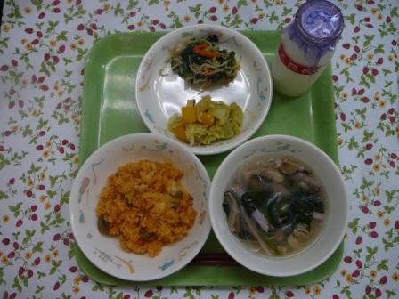 チキンライス 春雨スープ ほうれん草のピーナツあえ フルーツきんとん 牛乳