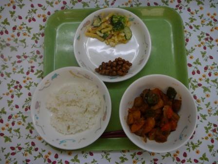 ごはん チキンカレー 海藻サラダ べっこうづけ 牛乳