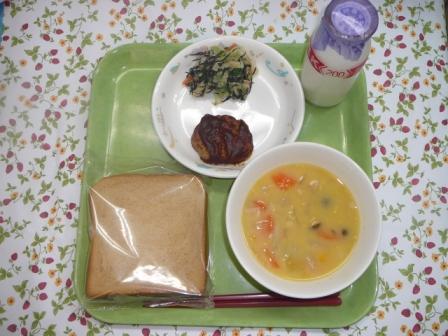 黒糖パン コーンポタージュ ミートハンバーグ ひじきサラダ 牛乳