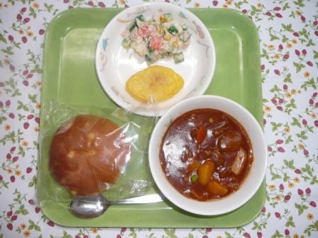 ごはん ポークカレー 大豆とハムのサラダ べっこう漬け 牛乳