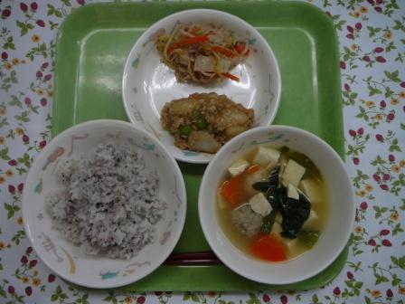 ごはん 豆腐のみそ汁 れんこんの春雨丼 鶏つくね 牛乳