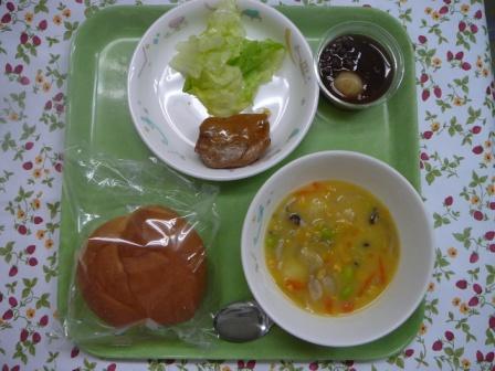 セルフバーガー(丸パン、照り焼きチキン、レタス) コーンポタージュ ぜんざい 牛乳