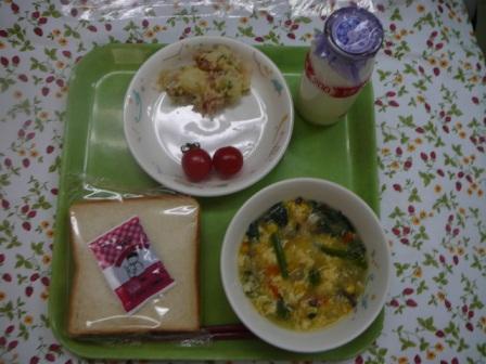 食パン マーシャルビーンズ 中華風コーンスープ ジャーマンポテト ミニトマト 牛乳