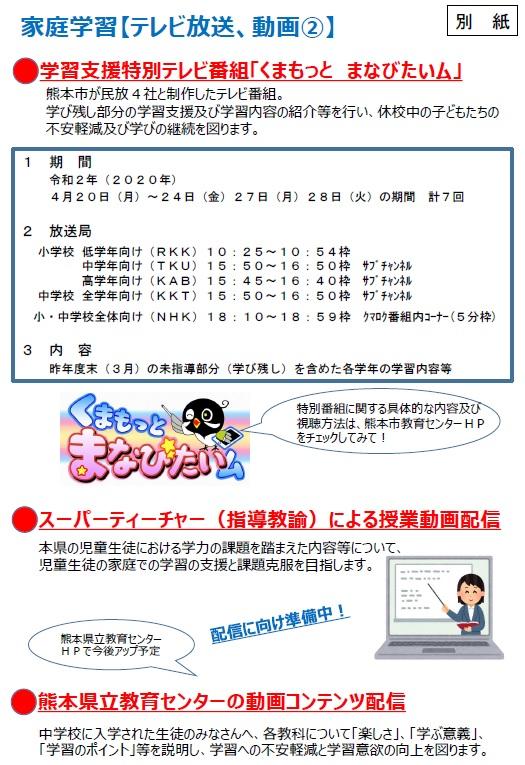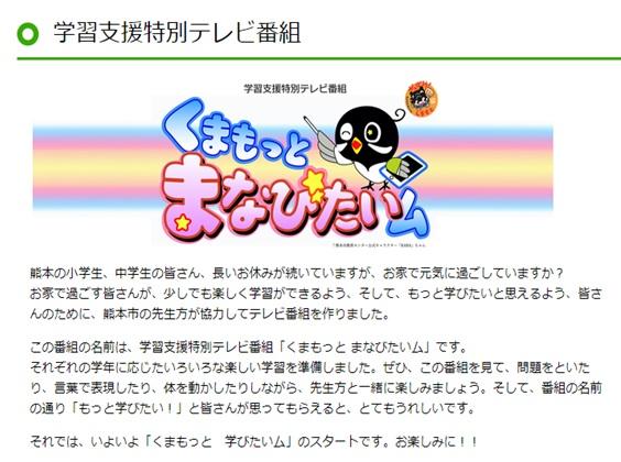 熊本市では、県内のテレビ局と教育委員会が共同して、休校中の小中学生のためのテレビ授業「くまもっと まなびたいム」が放送されるそうです。学習の一助としてご活用いただければ幸いです。放送日や放送時間は、以下の通りです。