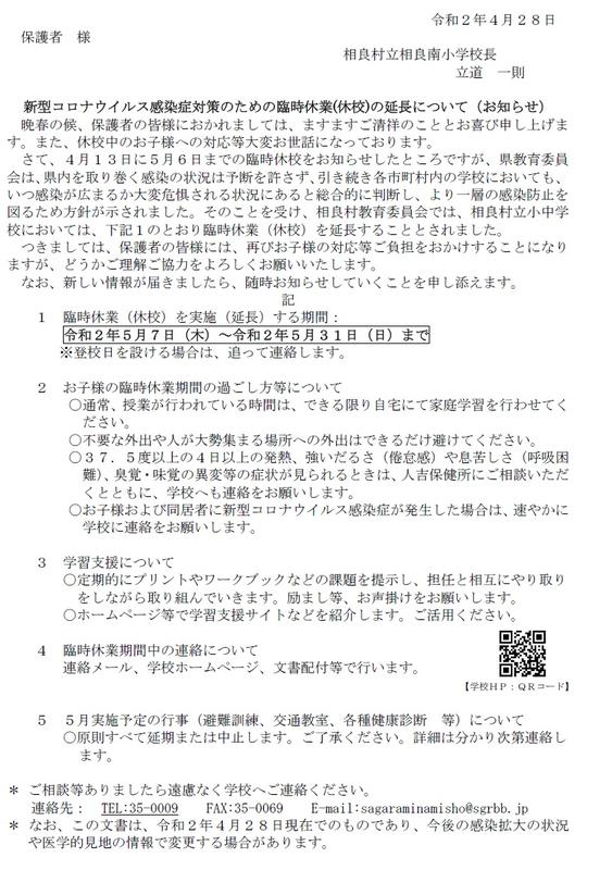 なお、今後の登校日につきましては、状況を見ながら追って連絡します。