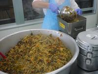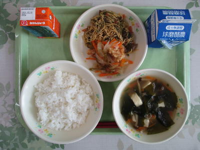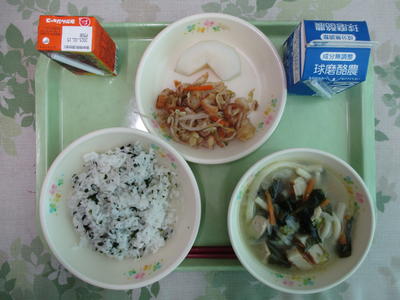 今日は、具だくさんのうどんを作りました。うどんの時は、ほぼ「わかめごはん」との組み合わせをしています。その理由としては、給食は食器の大きさと品数が決まっています。うどんだけにすると食器が小さいため、エネルギー量が不足してしまします。そこで、ごはんだけになっても食べられるようにうどんの時のごはんは味付けごはんにしています。普段の給食に比べるとみんなきれいに食べていましたので、今日の給食は大好きなメニューだと分かりました。