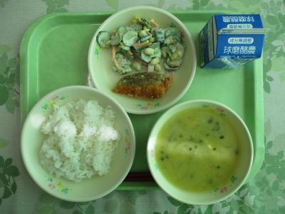 今日は、給食では定番の豆乳豚汁を作りました。豆乳とみその組み合わせで大豆の栄養をしっかりとれる一品です。豆乳を加えることでまろやかな味になります。和食の好きな児童が多いようで早く食べ終わることができました。