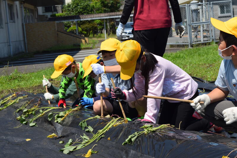 1年生みんなでいもの苗をうえました。中竹先生手作りの竹の棒に、苗をひっかけて土の中に刺していきます。