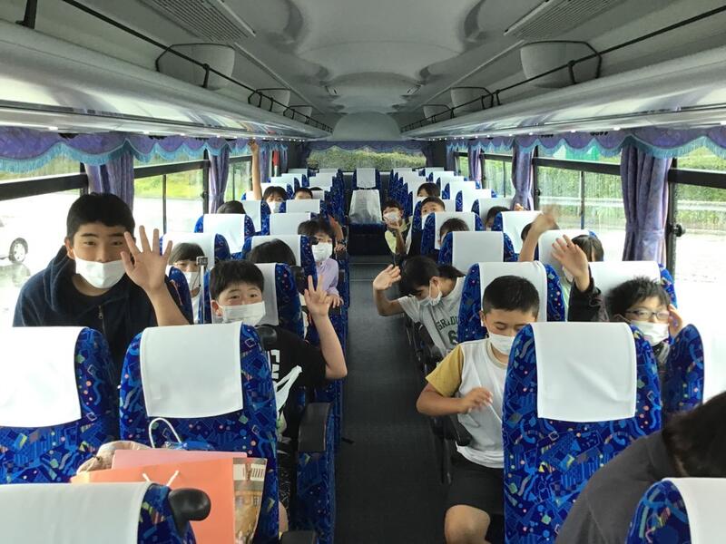 出発式です。雨のため体育館で行いました。 元気に行ってきます。