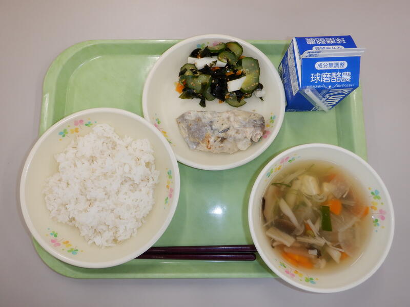 ・麦ごはん ・魚そうめん汁 ・鶏肉の茶衣揚げ ・キャベツの甘酢和え |