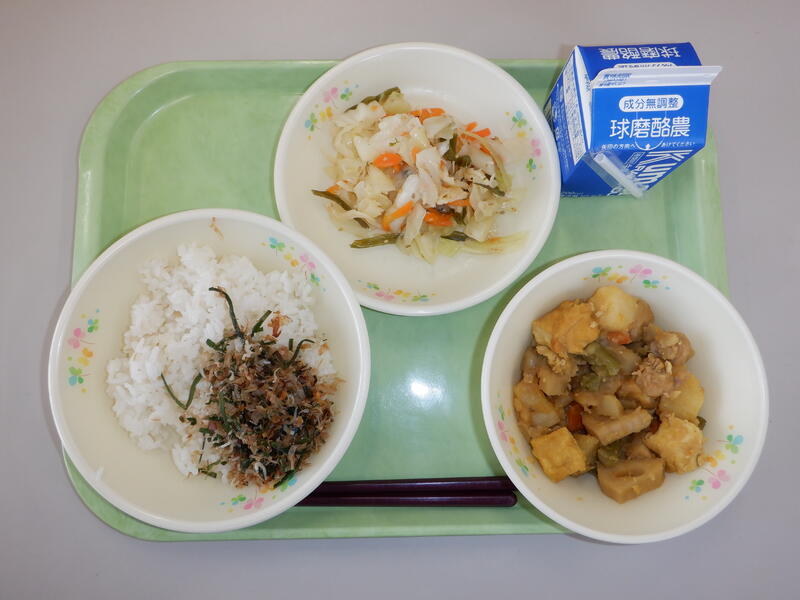 ・麦ごはん ・根菜の和風 カレー煮 ・カミカミ和え ・手作りふりかけ |
