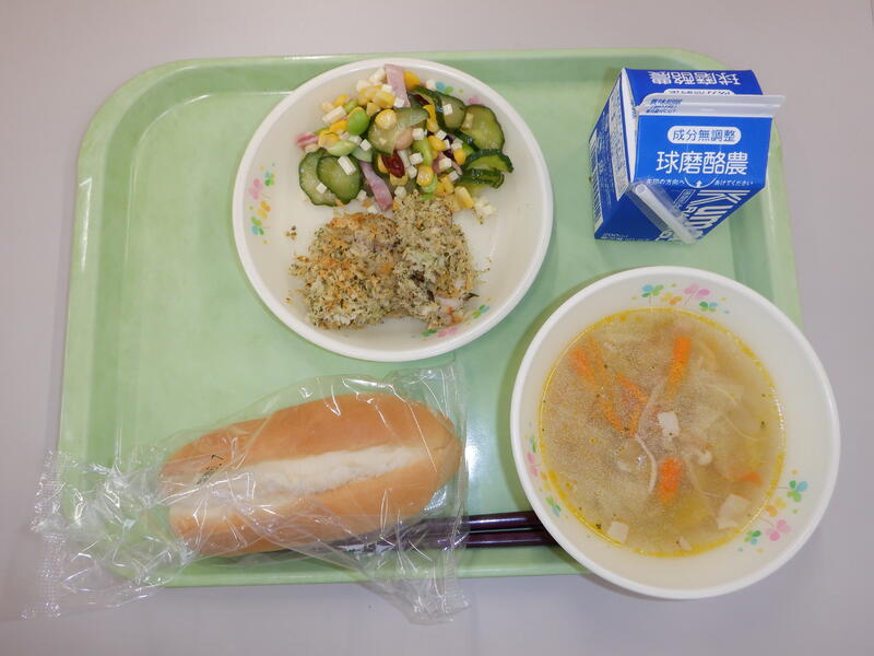 ・ソフトフランスパン ・野菜スープ ・鶏肉のパン粉 焼き ・ビーンズサラダ |
