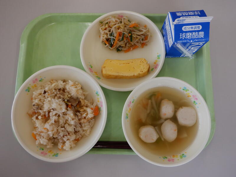 ・五目おこわ ・つみれ汁 ・厚焼きたまご ・もやしとにら のごま酢和え |
