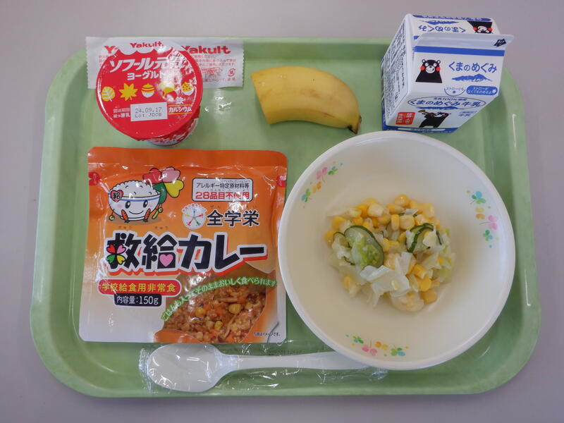 9月2日の給食では、長期保存できる「救給カレー」というカレーを食べ、災害時の食事を食べる練習をしました。非常食の入れ替え(ローリングストック)のために、毎年防災の日に合わせて「救給カレー」が出ます。