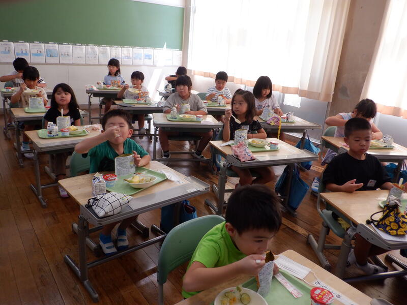 1年生は初めて食べる「救給カレー」。「おいしい!!」や「いつものと違う」という声が聞こえてきました。