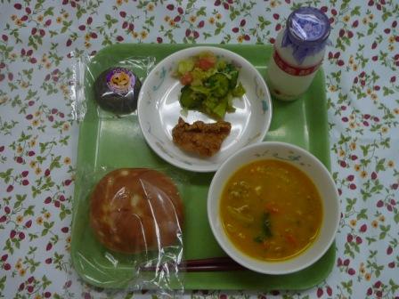 パインパン パンプキンポタージュ ベジタブルサラダ 鶏肉の唐揚げ デザート 牛乳