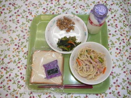 食パン ブルーベリージャム 冷やし中華 海藻サラダ 大豆とちりめんのかりんとう 牛乳