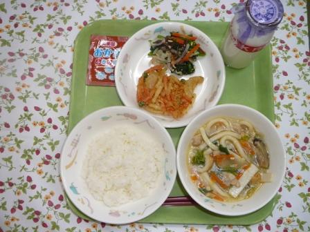 今日は、子ども達の大好きばうどんです。うどんの付け合わせとしてかきあげをつけました。