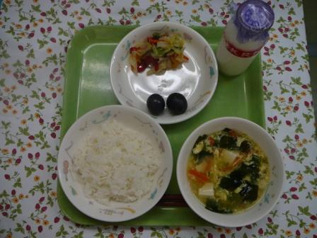 ごはん かきたま汁 スタミナサラダ ぶどう 牛乳