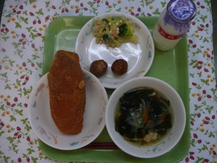 黄粉パン ワカメスープ ブロッコリーサラダ 肉団子 牛乳