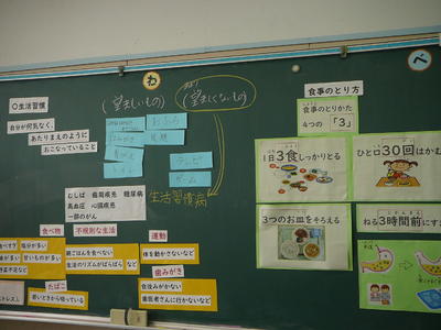 今日の給食の放送では、9月の保健指導で養護教諭の仲嶺先生と指導した生活習慣の話をしました。その中で仲嶺先生は生活習慣病について触れられました。食事のとり方が影響していることから、一口目は野菜からいただくことと。4つの「3」について紹介しました。