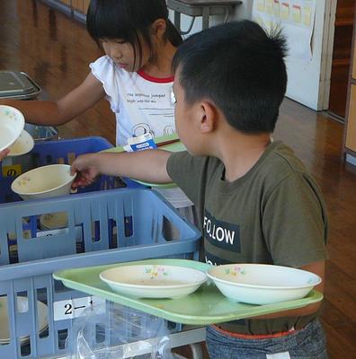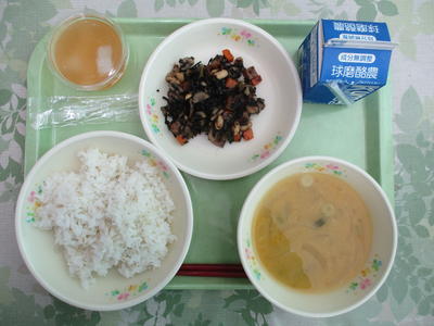 今日は、和食献立です。給食時間の放送では和食のよさについて話をしました。給食は毎日3つのお皿に4品を盛り付けて食べています。3つのお皿のおかげで、和食の基本一汁三菜の型が給食はとれます。3つのお皿をそろえることで栄養のバランスのとれた食事ができます。