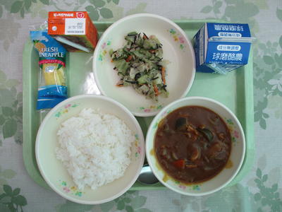 先日の休校措置に伴う給食停止により今月は何回か食材変更をしております。本日は、その時に使用せず保管しておりました未開封の調味料等を使用し、献立の一部を変更して実施しました。給食の献立も秋の料理に変化しつつありますが、本日は夏野菜たっぷりのカレーライスを作りました。たまねぎ・にんじんにかぼちゃ・なす・枝豆を加えました。栄養と愛情がたっぷり入ったカレーライスを作りました。