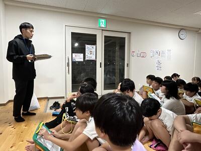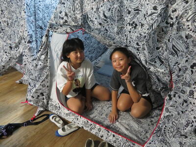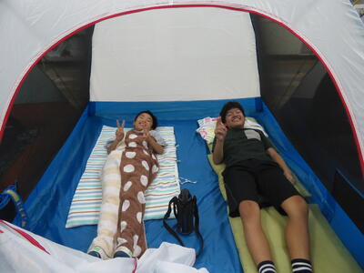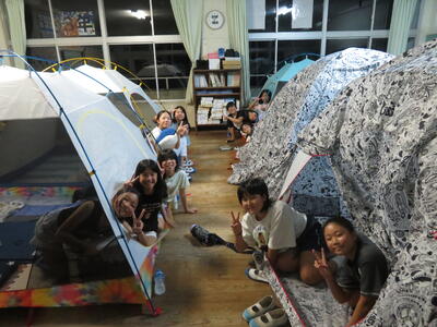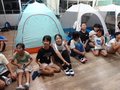 7月26日~27日、6年生が保護者や先生方のご協力により校内でキャンプを行いました。カレーを作って、きもだめしを校内で行い、保護者の方々が借りてきてくださったテントに宿泊。運動場での宿泊を急遽取りやめ教室でテントを張り寝ました。小学校の思い出作りがまたできましたね。保護者の皆様、ありがとうございました。