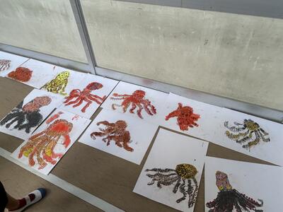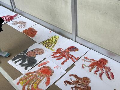 木曜日、大野先生のご指導のもと、タコの絵第二弾、学習しました。今回はタコと遊ぶ自分を描き加えました。