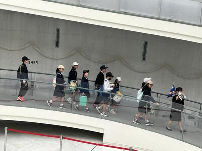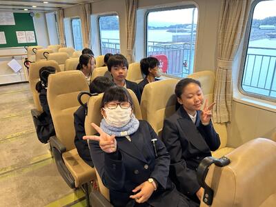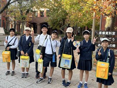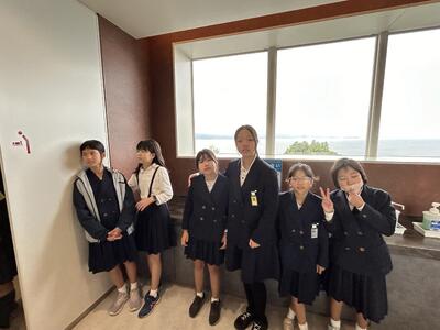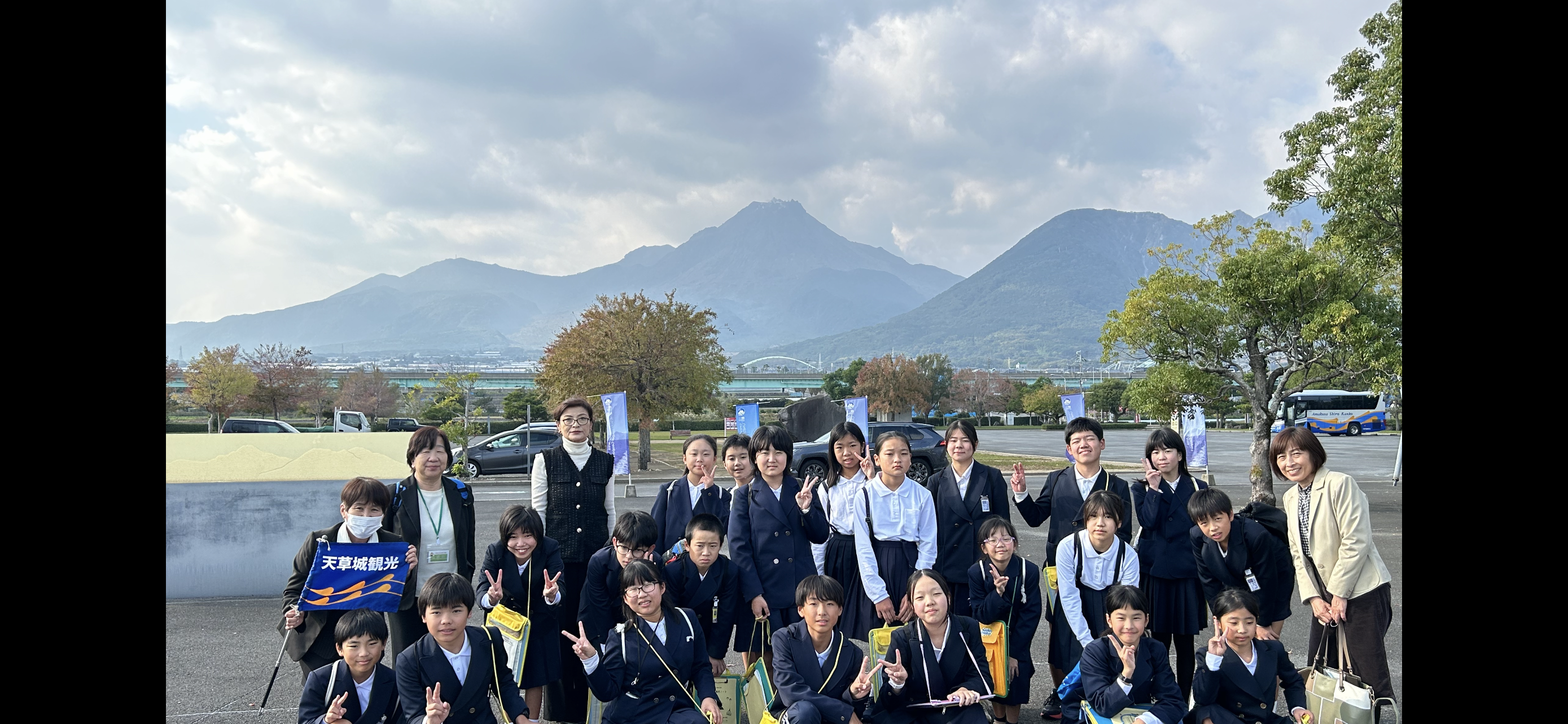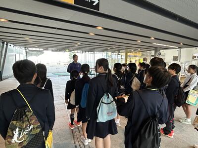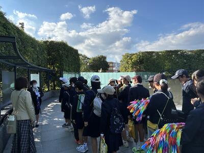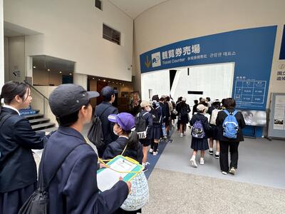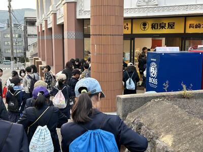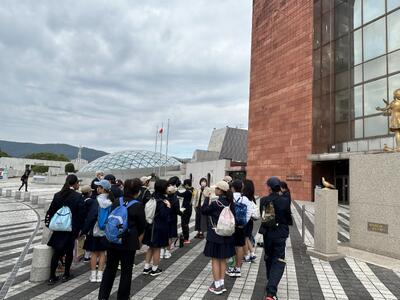 今日から修学旅行。みんな元気に出発!お見送りもありがとうございました。長崎に上陸。千々石のカステラセンターで休憩です。船酔いバス酔いあり、バスの席を替えて出発!原爆資料館に到着しました。