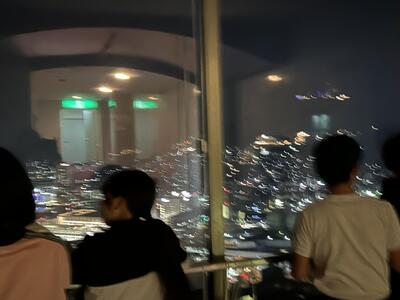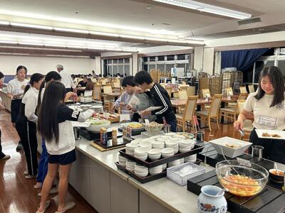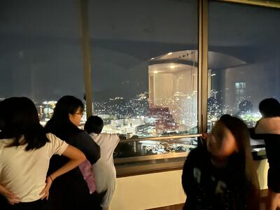お風呂、食事、夜景見物、ホテルの夜を満喫して、いま、六年生は会議中。班長、部屋長さんたちが木村先生と振り返りを行っています。