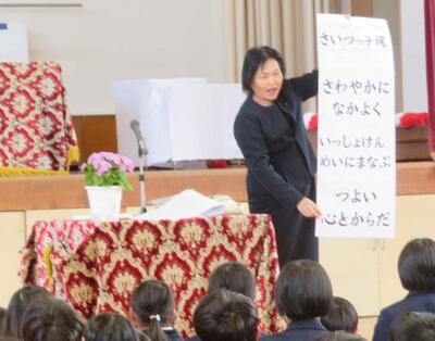 今日は現PTA会長、佐伊津小150周年実行委員長の酒田拓也様にご講話いただきました。令和7年度150周年を迎えるあたり、どのようなことをやってみたいか児童にまずは考えさせたかったこと、またそのためには佐伊津小のこれまでのあゆみやこれまでの佐伊津小の児童がどのように頑張ってきたのかをきちんと知る必要があり、佐伊津小学校の卒業生である酒田会長にご講話をお願いしました。