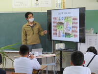 10月27日(木)、5年生の総合的な学習の時間に、サトウキビ栽培から黒砂糖の製造に取り組んでいらっしゃる冨山さんにおいでいただき、お話を伺いました。冨山さんには2年前にもおいでいただいています。