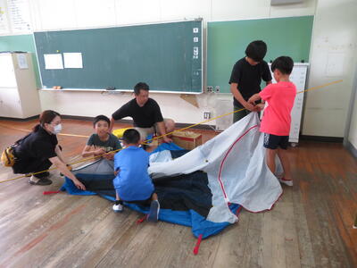 7月26日~27日、6年生が保護者や先生方のご協力により校内でキャンプを行いました。カレーを作って、きもだめしを校内で行い、保護者の方々が借りてきてくださったテントに宿泊。運動場での宿泊を急遽取りやめ教室でテントを張り寝ました。小学校の思い出作りがまたできましたね。保護者の皆様、ありがとうございました。