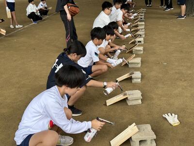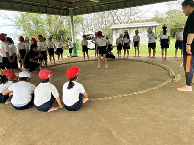 金曜日、午後から高学年児童、保護者有志の皆様、職員により、相撲場の準備が行われました。暑い中、水分補給を繰り返しながら頑張った高学年のみなさん、大変でしたね。