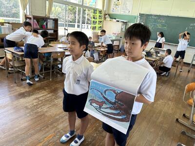 今日は低学年児童は文化展に向け、描画指導を受けました。講師は佐伊津小にいらっしゃった大野先生です。テーマはタコです。生きてるタコを上手に生き生きと表現していました。