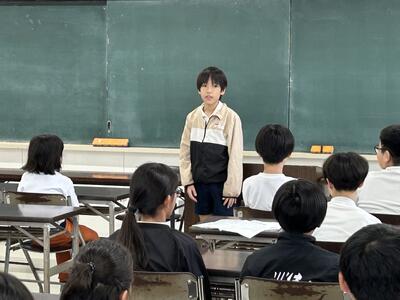 「地球温暖化」「平和」など自分で選んだテーマについて資料を効果的に使いなから考えを述べました。