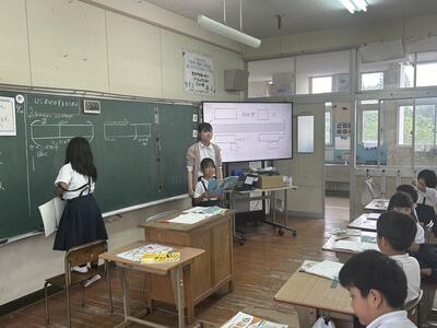 5月から1か月に渡り教育実習を本校で行ってくださいました本校卒業生の札本先生(明瀬地区)がいよいよ金曜日で実習の終了を迎えられます。本日、実習のまとめとして、算数の研究授業をなさいました。
