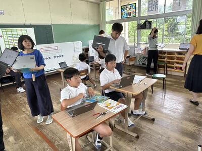 今日は1年生があさがおの観察をして、様子をタブレットに記入していました。花はいくつ、花の色は?みんな上手にまとめていました。1年生にはローマ字入力はできません。手書きしたものが変換される文字入力で頑張っていました。