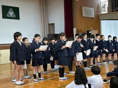 今日は二学期の児童の活動のまとめとして、いろいろなところで活躍した児童の表彰を行いました。ふれあい祭りや歯のポスター、漢字計算大会のダブル満点賞など、多くの児童が表彰されました。みなさん、おめでとうございます!