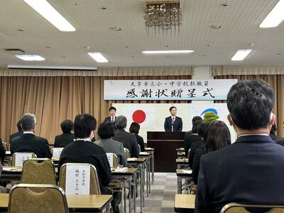 天草市の教職員感謝状贈呈式が本日市民センターで行われました。本校から田尻欣子先生が表彰されました。おめでとうございます!長きに渡り天草市の教育振興貢献に感謝の意が馬場市長より述べられました。
