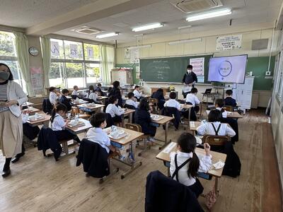 今日は給食記念週間の一環として、天草市教育委員会から平道教育委員様にご来校いただき、5年生と会食していただきました。