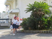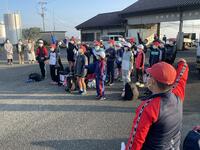 本日(11日)、5年生は佐伊津漁港に全員が集合し、天草青年の家をめざして出発していきました。