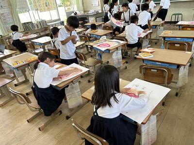 本校では、6月に自分自身の歯の健康について考えています。今日は4年生は歯の染め出しをして、歯磨きの状況を振り返り、また、1年生は歯を大切にするポスターにチャレンジしていました。