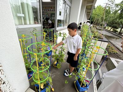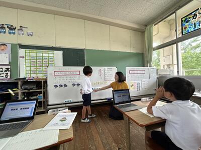 今日は1年生があさがおの観察をして、様子をタブレットに記入していました。花はいくつ、花の色は?みんな上手にまとめていました。1年生にはローマ字入力はできません。手書きしたものが変換される文字入力で頑張っていました。